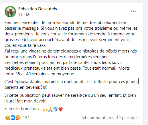 Des complotistes tentent de répandre des rumeurs sur des effets néfastes en lien avec la vaccination des femmes enceintes. Toujours jouer avec la peur des gens vulnérables.