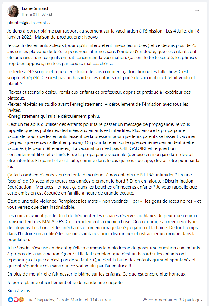 La coach d’enfant acteur, Liane Simard, très connue sur les plateaux de tournages québécois et très volubile au sujet des mesures sanitaires en lien avec la lutte contre la pandémie de COVID, porte plainte contre Julie Snyder au CRTC. Elle l’accuse d’avoir utilisé des enfants pour avoir passé un message de haine sur les ondes publiques. Une autre qui ne tient pas à sa carrière dans le milieu artistique…