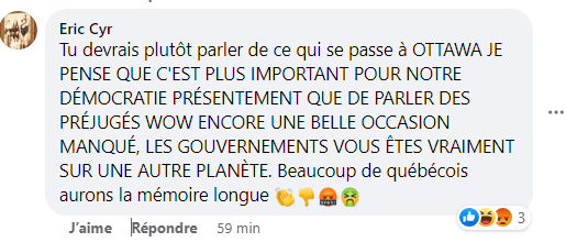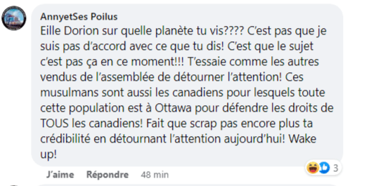 Afin de commémorer la journée nationale de souvenir de l’attentat de la Grande Mosquée de Québec, un camionneur, sympathisant de la contestation antivaxx d’Ottawa, s’en prend à la députée de Québec Solidaire et menace d’aller faire le « ménage » à Québec, après ce qui se passe, ce week-end, dans la capitale fédérale. Disons que c’est n’est pas le meilleur moment pour faire ce genre de menace. C’est encore plus odieux quand on sait que le mouvement actuel est parrainé par des groupuscules ouvertement islamophobe et qu’Alexandre Bissonnette, le terroriste de la mosquée, était lui-même gavé de théorie du complot avant de commettre ses action.