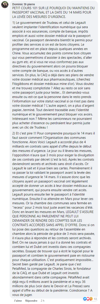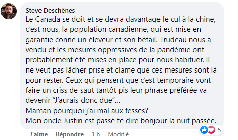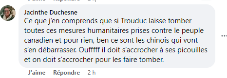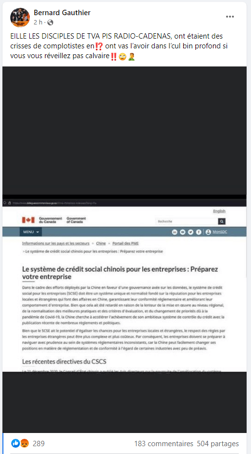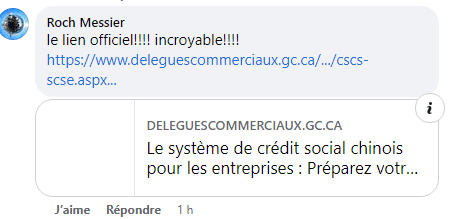 Bernard partage une page du site web du délégué commerciale du Canada expliquant aux entrepreneurs ce qu’est le crédit social chinois, avec pour objectif d’informer d’éventuels citoyens canadiens de cet état de fait advenant le cas où quelqu’un voudrait faire affaire avec ce pays en croyant que le gouvernement Trudeau cherche a imposer lui-même cette mesure autoritaire.