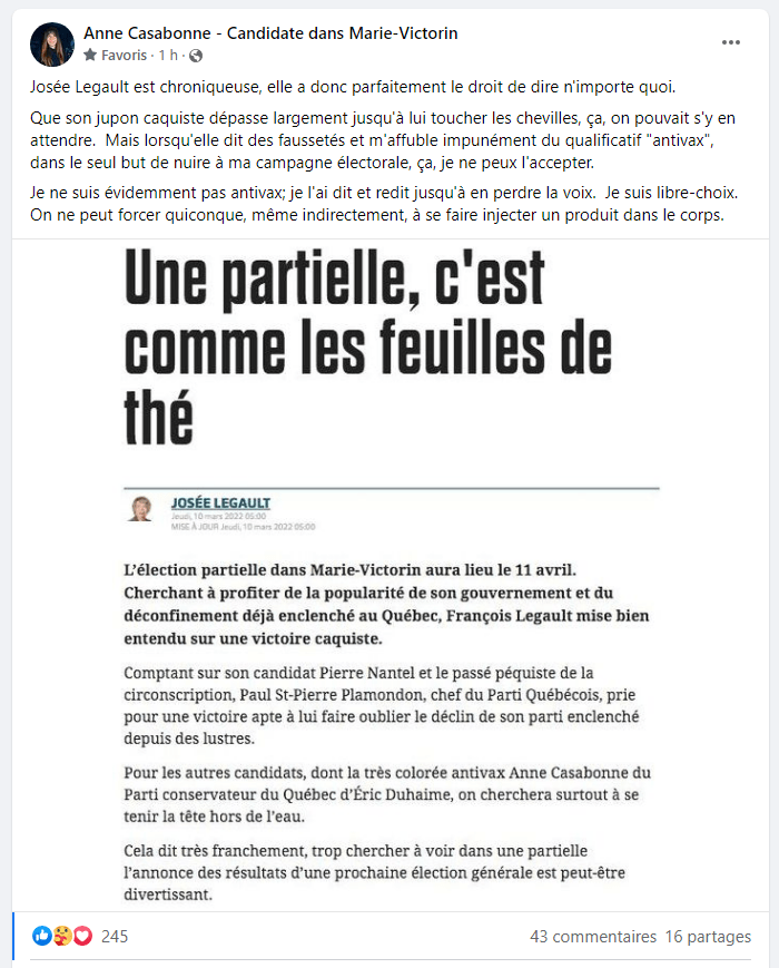 Anne Casabonne répond à Josée Legault qu’elle est prochoix. C’est plutôt ironique de ne rien avoir dit sur son collègue conservateur anti-avortement…