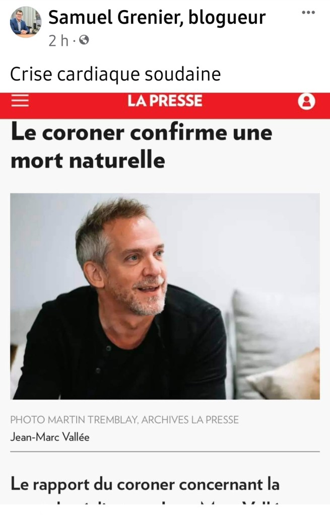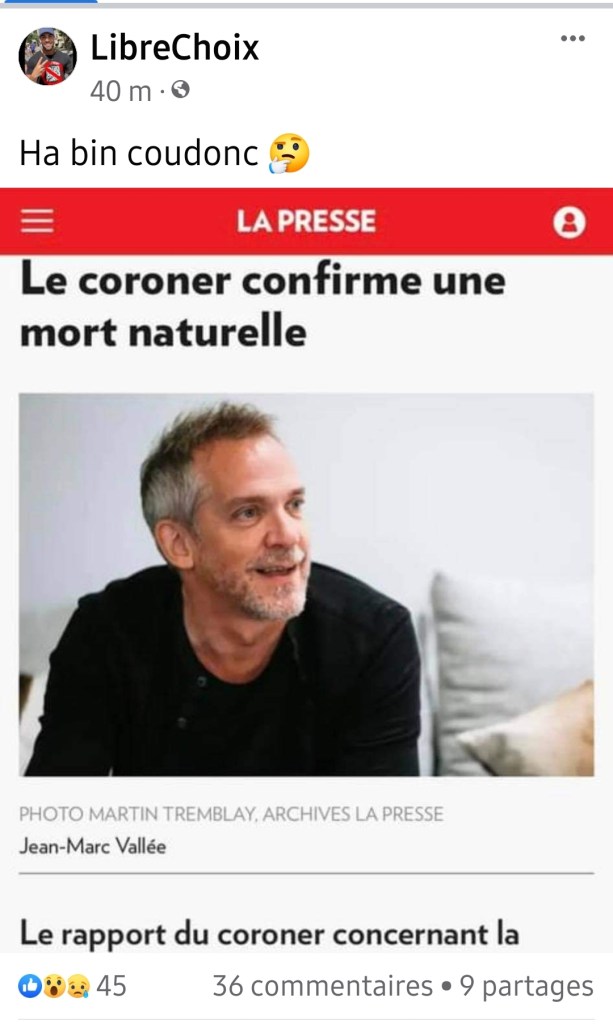 Les leaders complotistent tentent de semer le doute sur les causes réelles du décès du réalisateur québécois Jean-Marc Vallée, suite au dépôt du rapport du coroner, en lien avec cet événement.