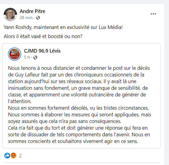 Propos ordurier sur le décès de Guy Lafleur – André Pitre prend la défense de son chroniqueur