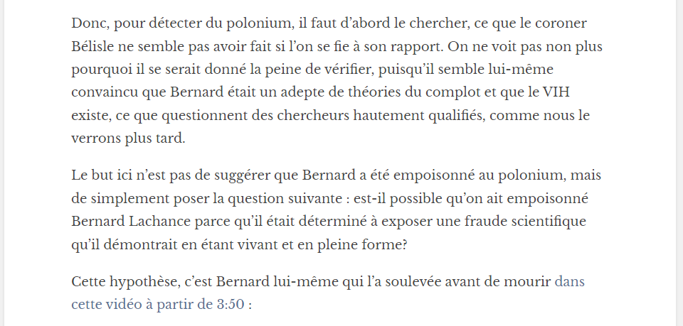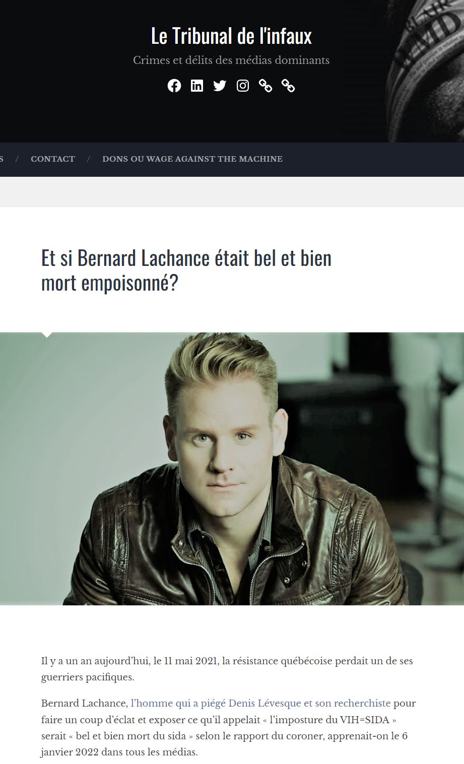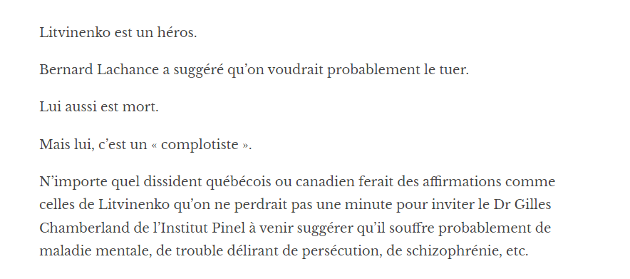 Dans un long texte, la responsable des communications de la Fondation pour la défense des droits et libertés du peuple et bloggeuse, Julie Lévesque, essaye de faire accroire à ses lecteurs que Bernard Lachance aurait pu être assassiné…
