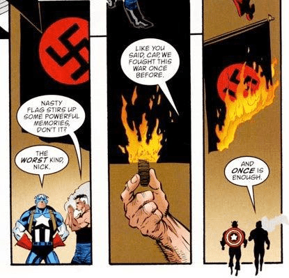 Captain America a littéralement combattu les nazis et continue de combattre encore des vilains ayant des visés totalitaires comme l’Hydra et ses sbires.